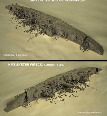 A dedication to HMS Exeter, the shipwreck that disappeared, featuring 3d renditions of the wreck, by Kevin Denlay and Stefan Draminski Interviews, Photo gallery, Shipwrecks, Then and Now, WW2, WW2 Pacific Treasures