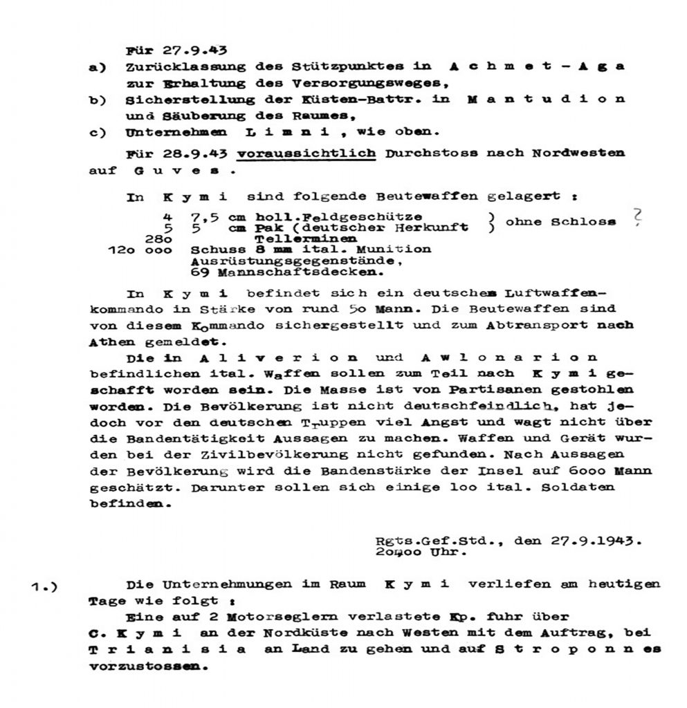 Το 1942, υπήρχε στο Γυμνάσιο της Κύμης, μονάδα της γερμανικής πολεμικής αεροπορίας, αποτελούμενη από περίπου 50 άντρες, οι οποίοι είχαν ως ευθύνη τους την λειτουργία του ραντάρ παράκτιας επιτήρησης. Τον Μάρτιο και συγκεκριμένα την ημέρα πτώσης του αεροπλάνου, υπήρχε στην Κύμη και μονάδα ειδικών δυνάμεων- Gebirgsjäger, (Ορεινοί Κυνηγοί). Στη σελίδα που ακολουθεί, αποδεικνύεται η αναφορά σχετικά με την μικρή μονάδα της γερμανικής πολεμικής αεροπορίας που βρισκόταν στρατοπεδευμένη στο γυμνάσιο της Κύμης με σκοπό τον χειρισμό ραντάρ. Η σελίδα προέρχεται από την αναφορά των γερμανικών δυνάμεων που έφτασαν στην Κύμη στις 27 Σεπτεμβρίου του 1943 μετά την συνθηκολόγηση και αποχώρηση των Ιταλών.