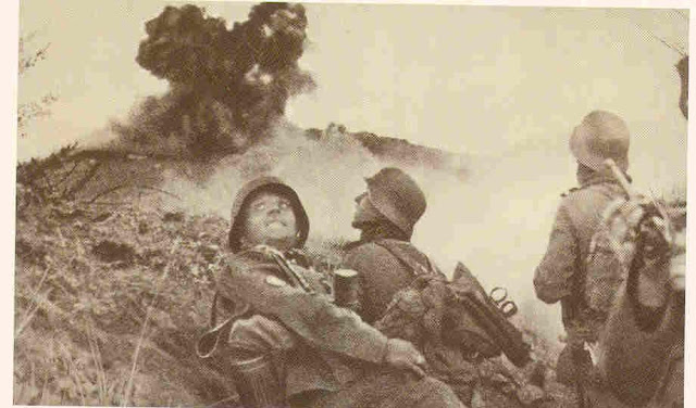 | Assault troops take cover while Ju87s bomb the fortifications |