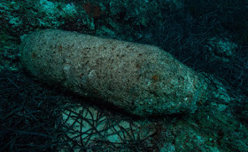 | A scuba diver hovers above a ΑΝ-Μ64 bomb found in the Saronic Gulf, Greece. Photo by Nikos Karatzas, http://aviationarchaeology.gr/ |