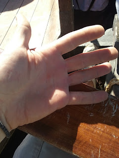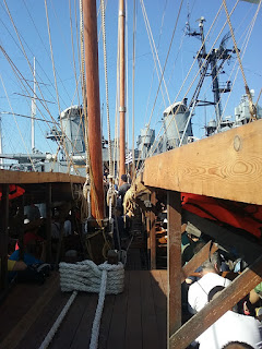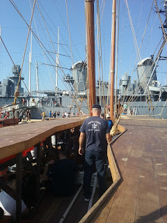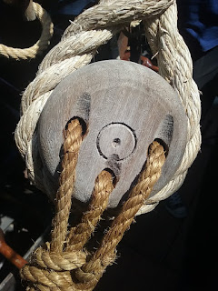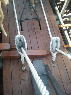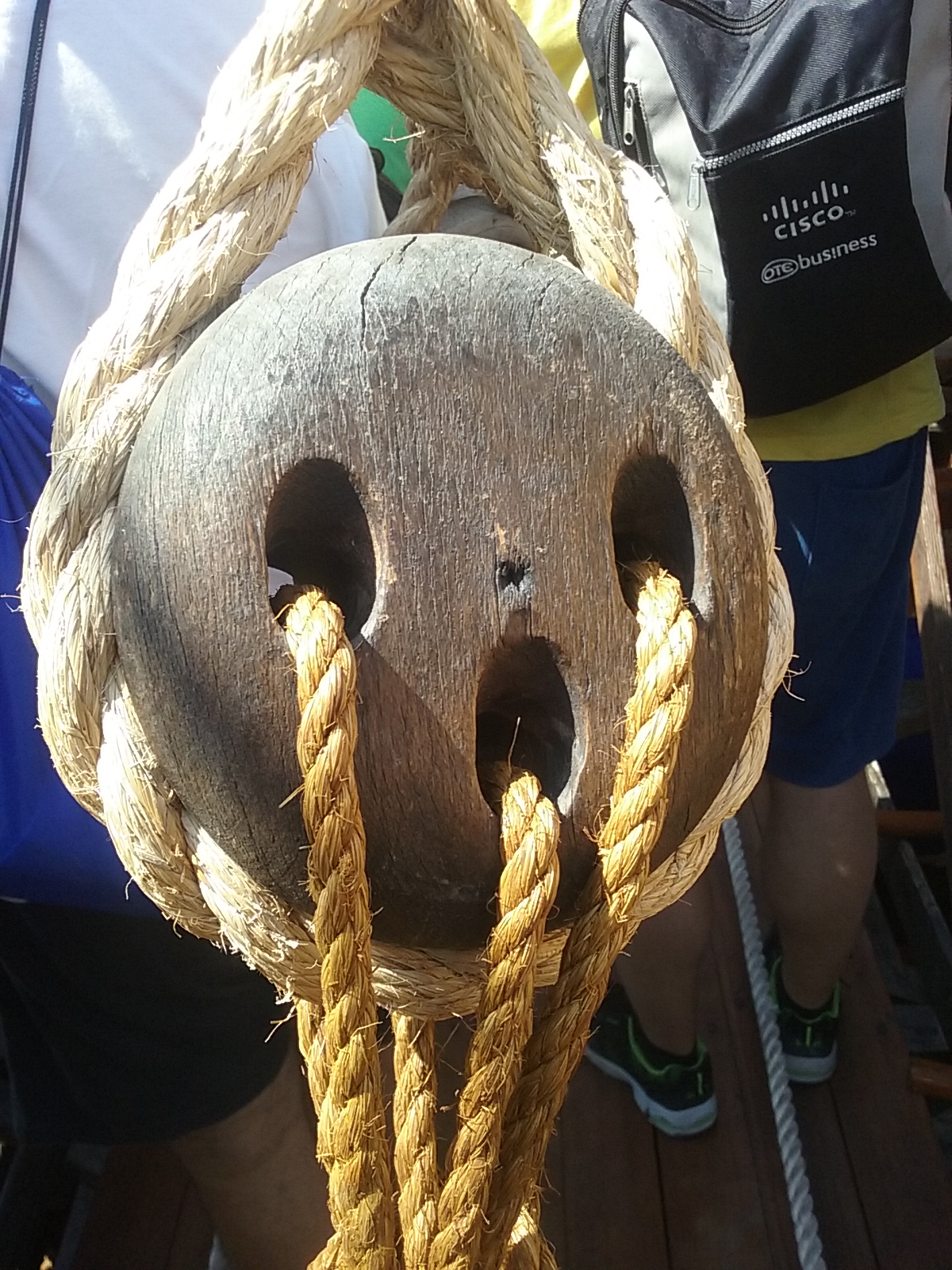 The steel cables’ tension varied as the hull bent on the waves, rather than exerting constant tension like a natural fibre rope. This caused the alarming possibility of the rope breaking and endangering the crew, so protective measures had to be taken.