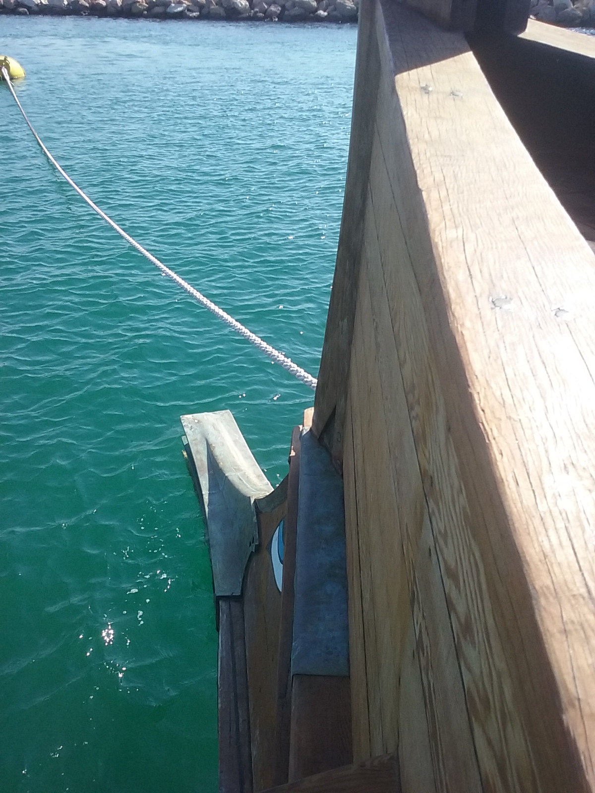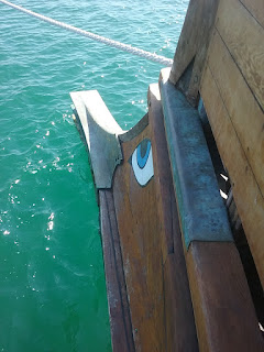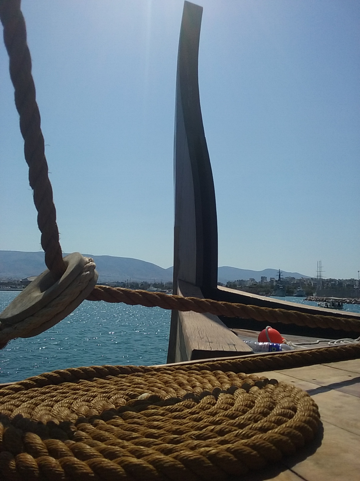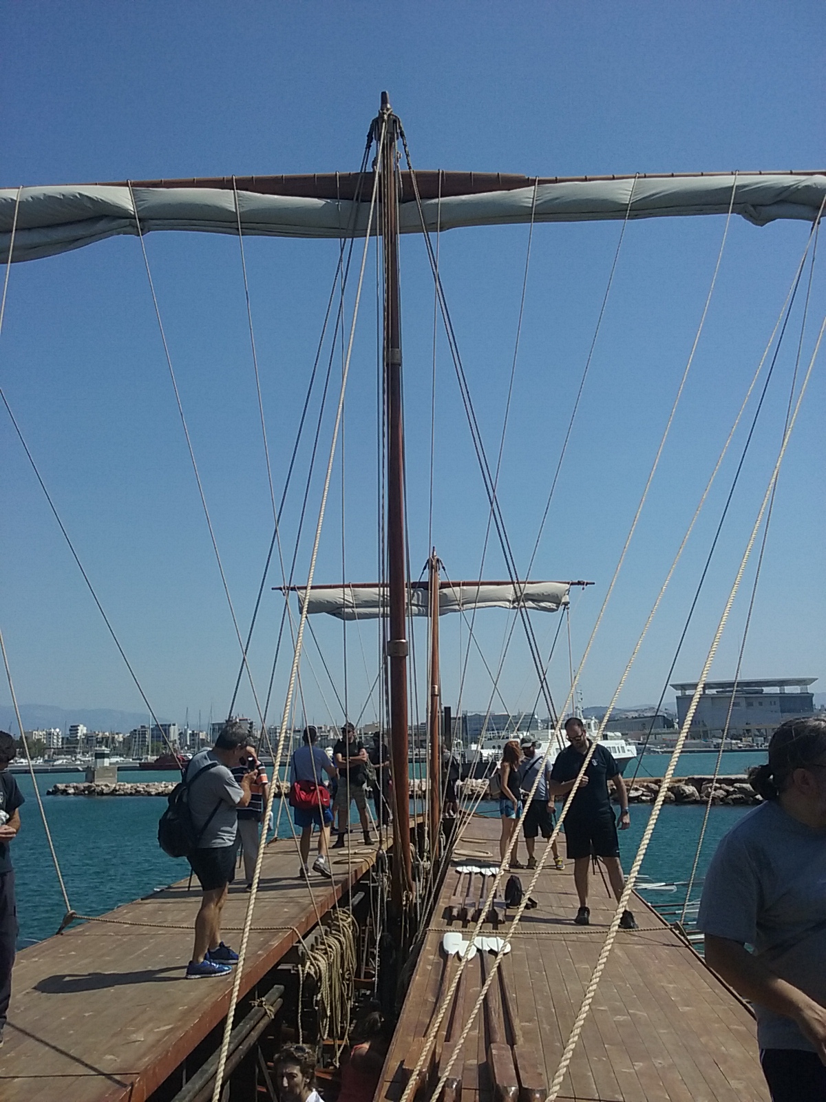 The bronze bow ram weighs 200 kg. It is a copy of an original ram now in the Piraeus archaeological museum. The ship was built from Oregon pine and Virginia oak. The keel is of iroko.