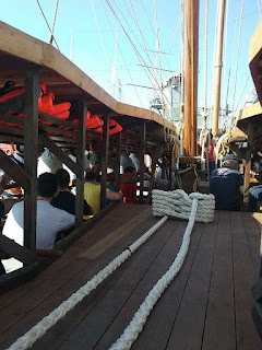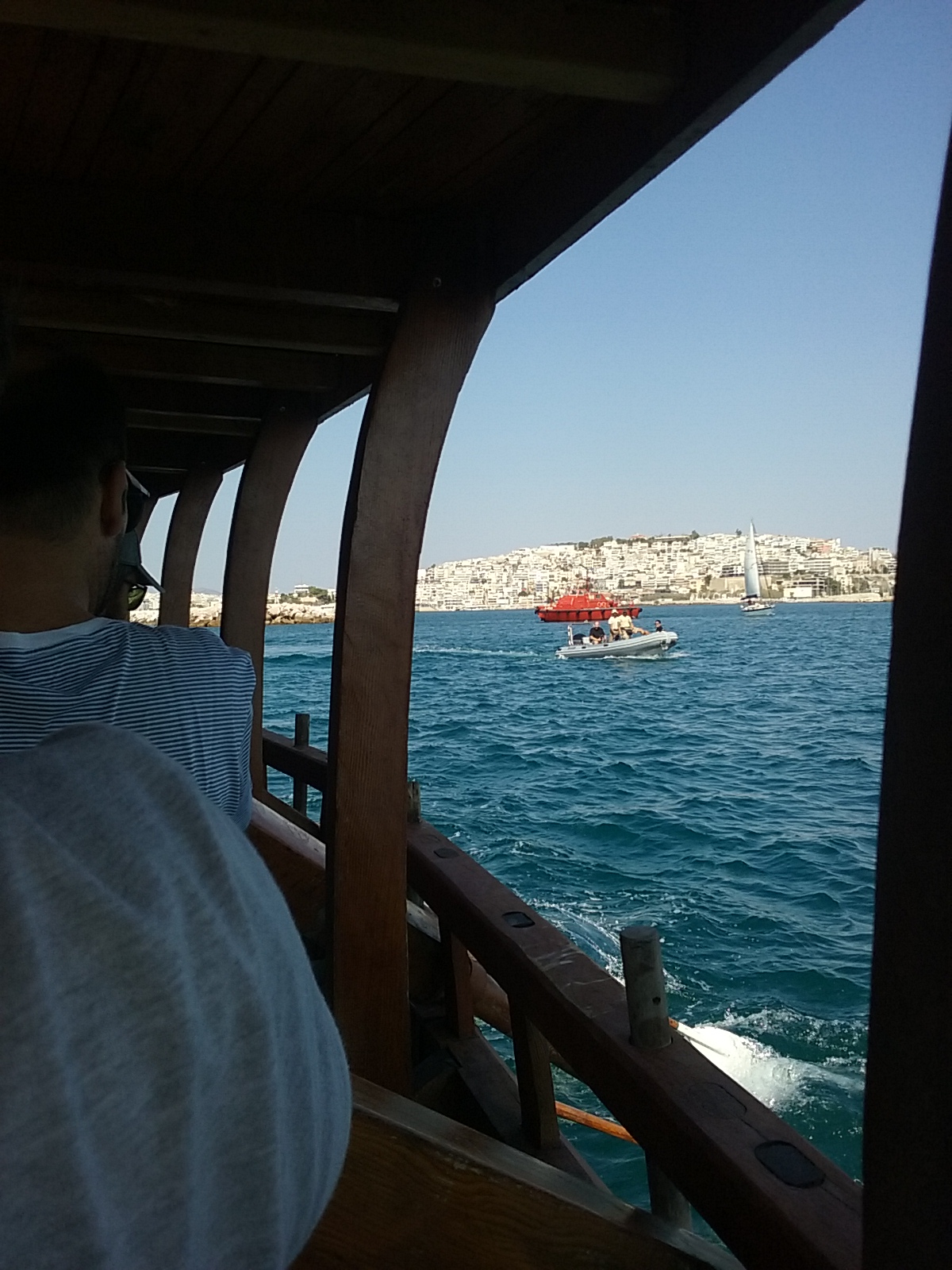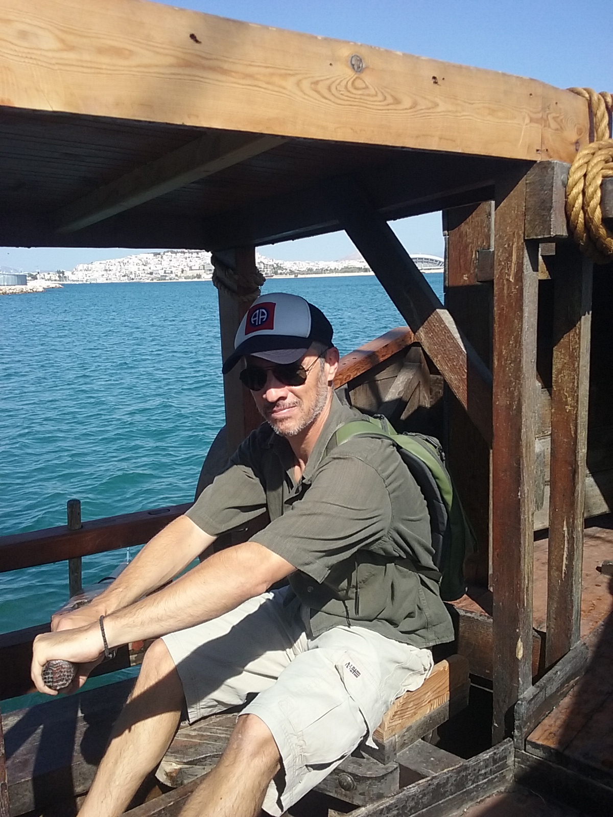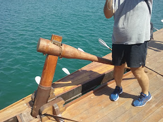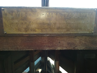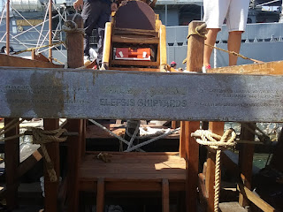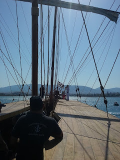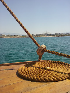 The bronze bow ram weighs 200 kg. It is a copy of an original ram now in the Piraeus archaeological museum. The ship was built from Oregon pine and Virginia oak. The keel is of iroko.