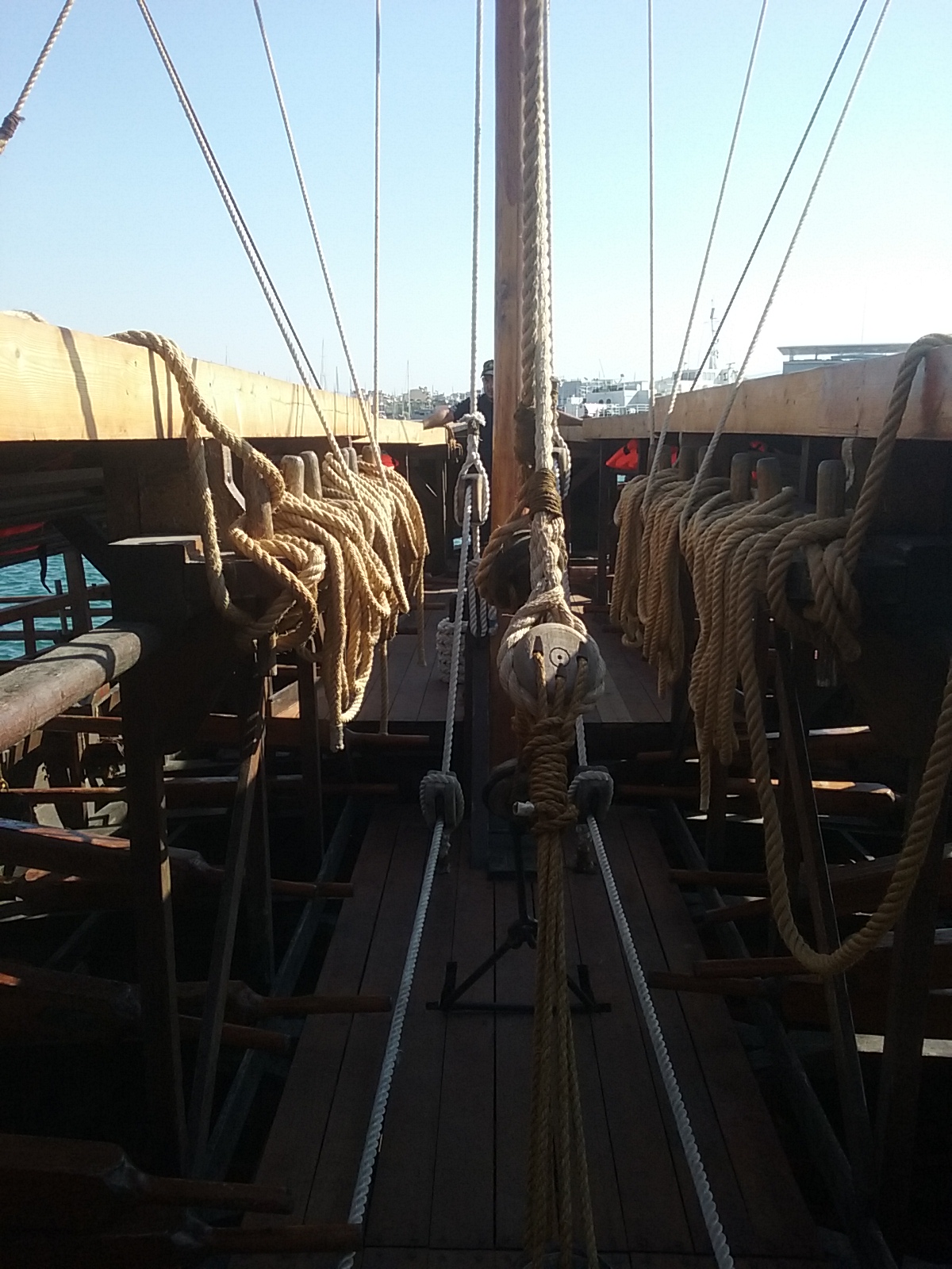 The trireme was a fast attack, light displacement vessel. In order to sustain the bending moments of her considerable length, a tightened rope (hypozomata) was mounted beneath the deck spanning from bow to stern.