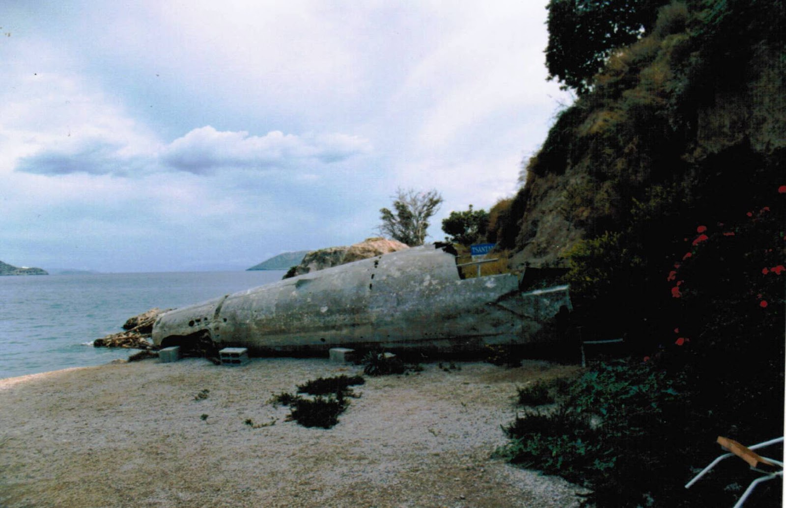 | The fuselage of the He111 at Panteli beach, Leros in 2013. Shortly afterwards the wreck disappeared. Photo Credit: Andrew Clark |