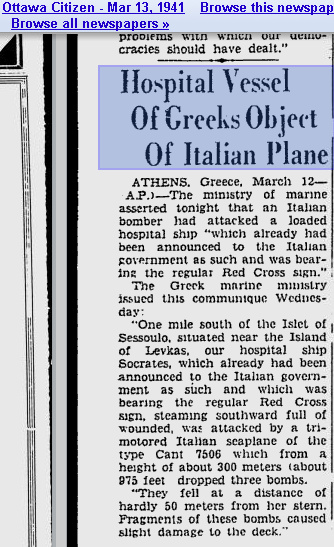 The Italian bomber dropped its bombs from a height of approximately 200 to 300 metres, as evidenced by reports of the time in newspapers of Greece, England, Australia and Canada. Fortunately though, the Italian bombs missed the hospital ship and only caused minimal damage and no casualties and “Socrates” continued its voyage.